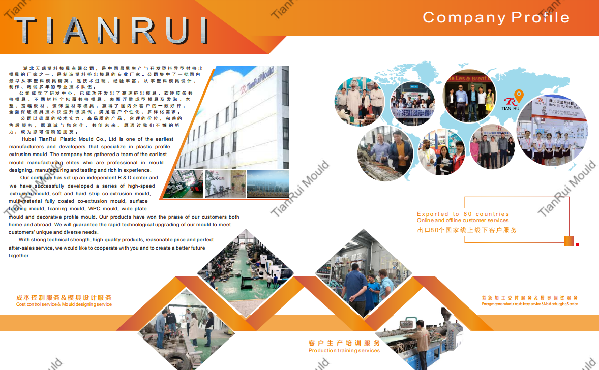 Hubei TianRui Plastic Mould Co., Ltd is a professional mould manufacturer with 3000 square meters workshop and 60 skilled technical workers. Hubei Tianrui Company has accumulated over 18 years of experience in the technology of extrusion mould. From mould designing, production to commissioning, we have cultivated a mature team of personals. Tianrui Company applys the high-pressure low-turbulence design in the product development and production. The combination of formulation process, production operation, equipments and moulds makes the products achieve the best results.Our company regularly sends technical personnel to study abroad, and actively introduces foreign advanced technology to research new products. Commissioning and after-sales service of mould: mould debugging is one of the most important aspects to ensure the quality of the mould. The Company is equipped with a mould debugging center. The advanced extrusion production line and the simulation of extrusion process conditions for initial commissioning have provided a guarantee for qualified mould before it leaves the factory.